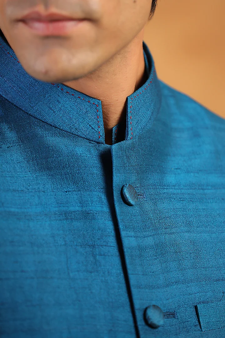 Featuring a blue bundi jacket in raw silk base with thread work. Style it with a classic kurta set for a festive occasion or pooja ceremony, exuding traditional charm and